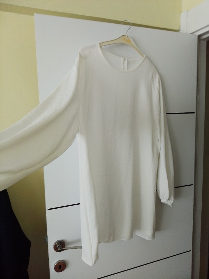 Yumuşak keten kumaştan, bol kesim, uzun kollu ve drapeli beyaz hamile bluz, günlük kullanıma uygundur.