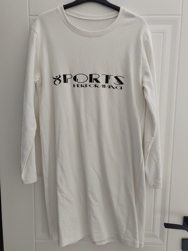 Beyaz pamuklu hamile spor elbisesi, uzun kollu ve yuvarlak yaka. Gri baskılı 'BPORTS PERFORMANCE' yazısı bulunur, rahat ve bol kesimdir. ♀️
