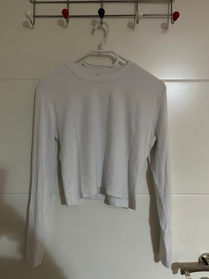 Duz beyaz uzun kol cropa yakin, 1 kere giydim, xl diyor ama ben m giyiyorum bol olsun diye xl almistim cok bol olmadi