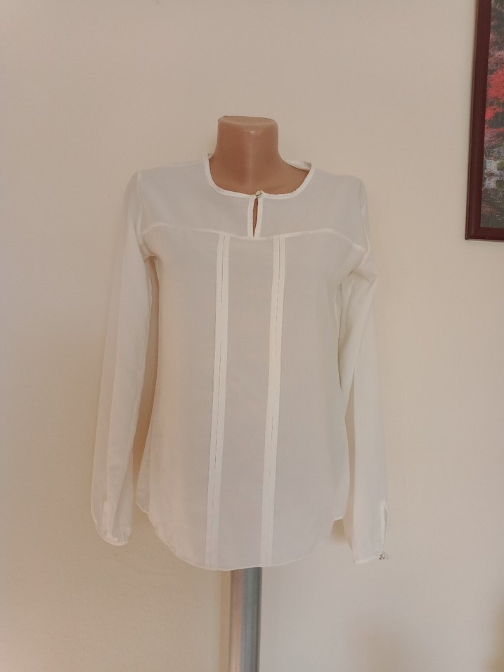 Beyaz renkte, uzun kollu ve yuvarlak yakalı kadın bluzudur. Pamuklu kumaştan yapılmış, rahat kesim ve kısa boyludur. Minimalist, desensiz tasarımıyla ofis için uygundur.