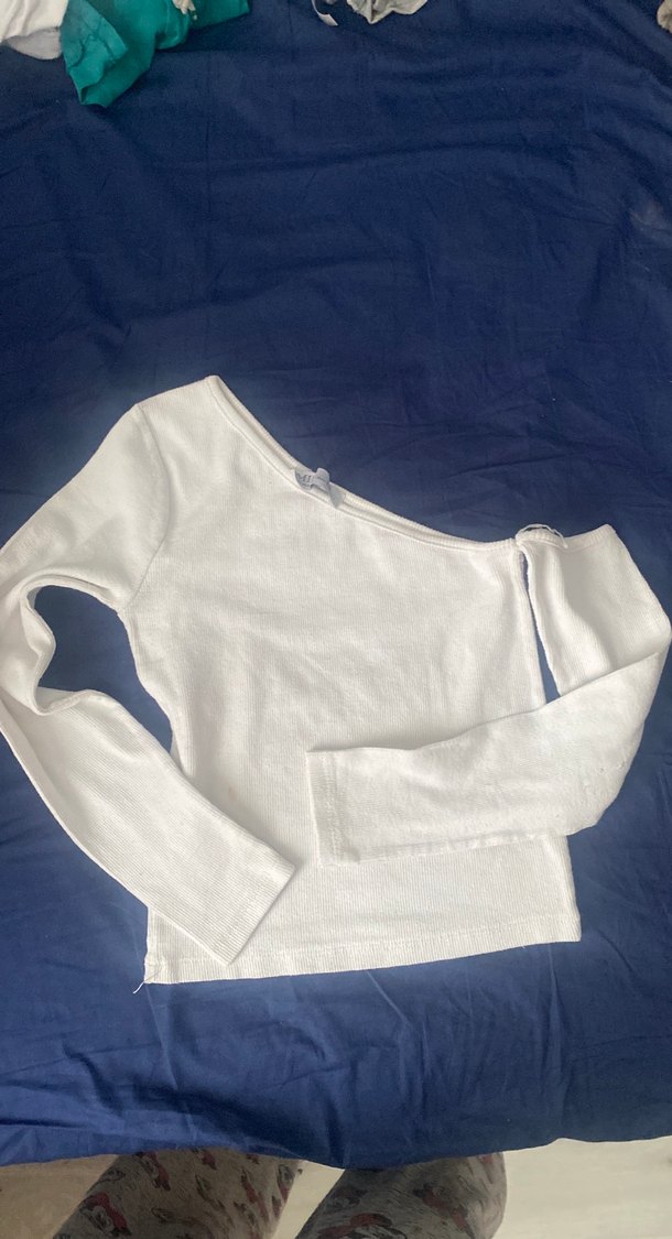 Bu beyaz kadın keten bluz, tekne yaka ve uzun kolludur. Dar kesim ve normal boydadır, minimalist sokak stiline uygundur. Önünde sadece iki leke vardır ama dikkatli bakılmadan belli etmez