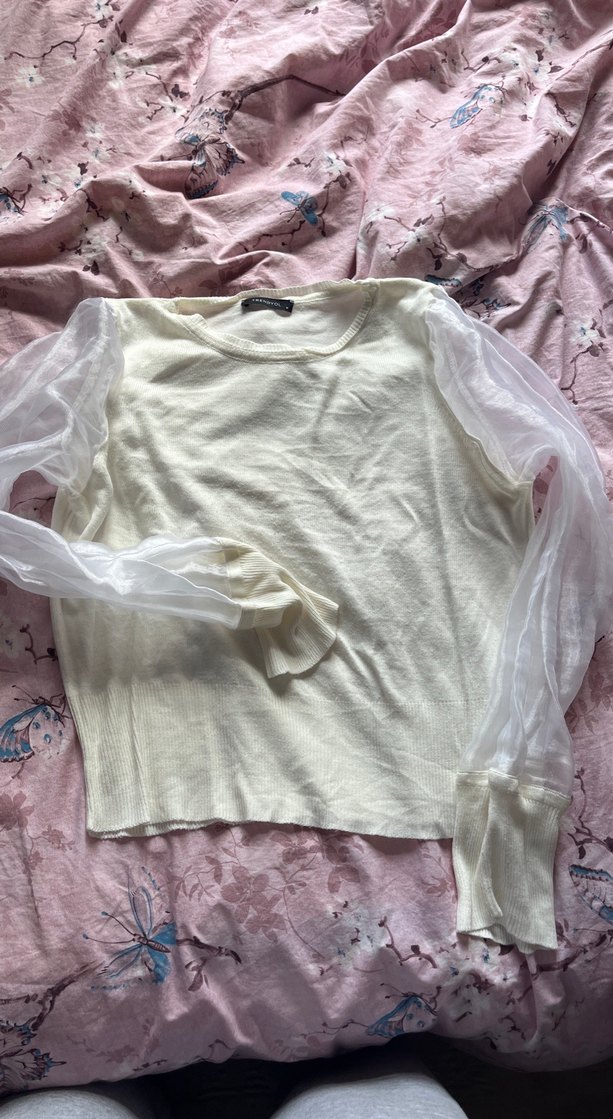 Beyaz kumaştan, uzun şeffaf kollu, yuvarlak yakalı ve bol kesim kadın bluz, günlük rahat sokak stili için uygundur.