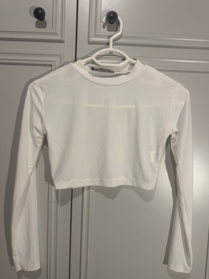 Pamuk kumaştan, uzun kollu ve bisiklet yaka, beyaz renkli, minimal ve şık kadın crop top.