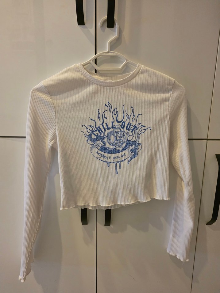 Beyaz, pamuklu, örme kumaştan uzun kollu, baskılı ve bisiklet yaka crop top. Sokak stiline uygun, vücuda oturan kesim.