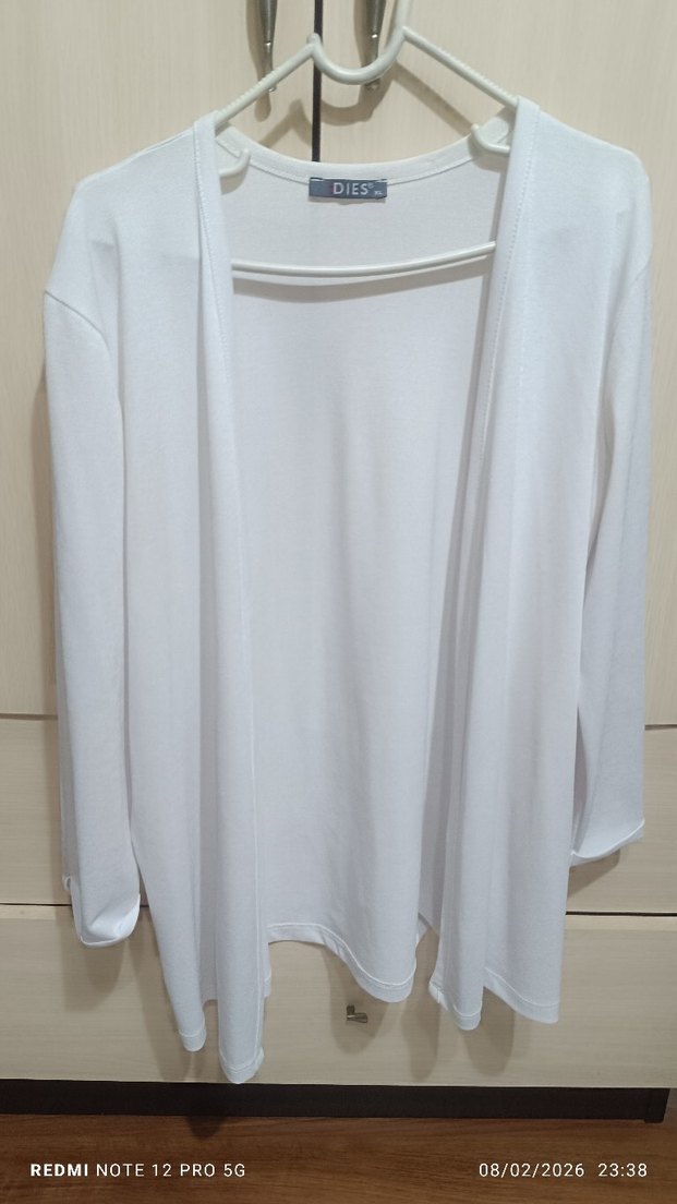 DIES markalı beyaz pamuklu hırka, uzun kollu, yuvarlak yaka ve bol kesim ile sade ve rahat bir stil sunar. Günlük kullanım için uygundur.