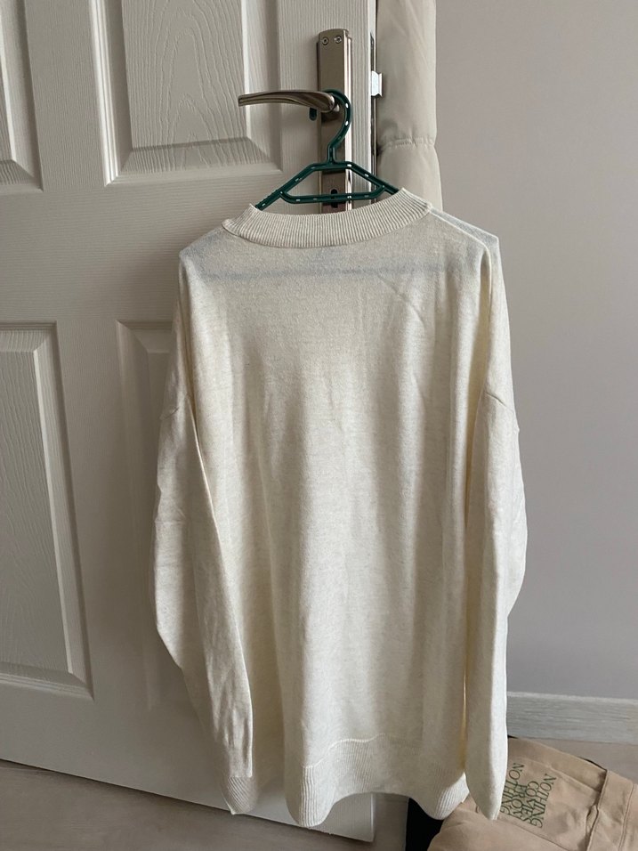 Beyaz,uzun kollu ve yuvarlak yakalı kadın kazak. Salaş kesimi ve diz boyu uzunluğuyla minimal ve sade bir görünüm sunar. Günlük kullanıma uygundur.