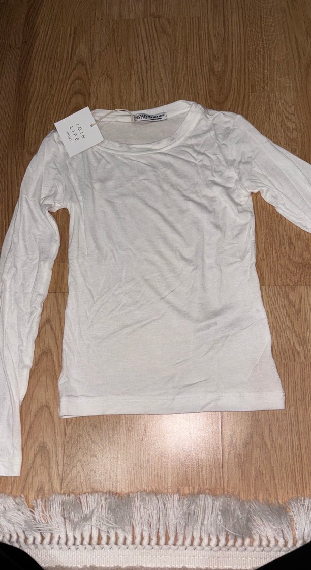 Beyaz renkte,uzun kollu ve bisiketyaka, sade ve minimal tasarımlı, günlük kullanıma uygun kadın tişörtü.