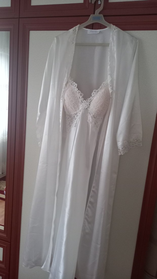 Bol kesim, uzun beyaz kadın sabahlık, askılı kollu ve dantel detaylı, rahat ve klasik tarzda. Hafif ve desensiz kumaş konfor sağlar.