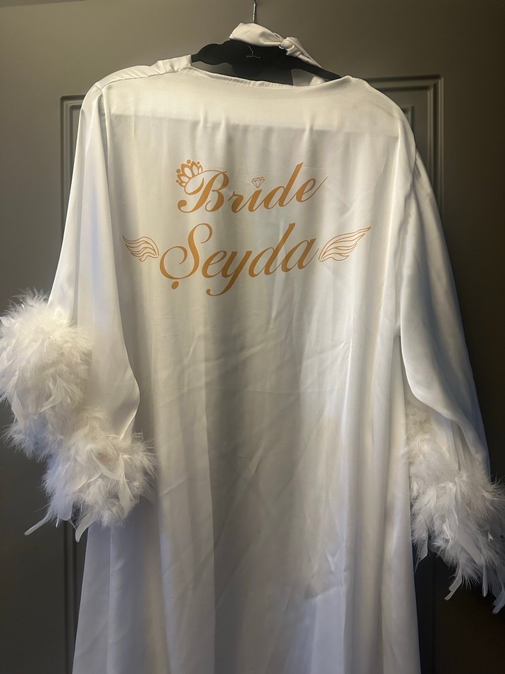 Bu beyaz kadın sabahlık, tüy detaylı uzun kollu ve bol kesimdir. Parlak baskılı 'Bride Seyda' yazısı çekim sabahlıgıdır