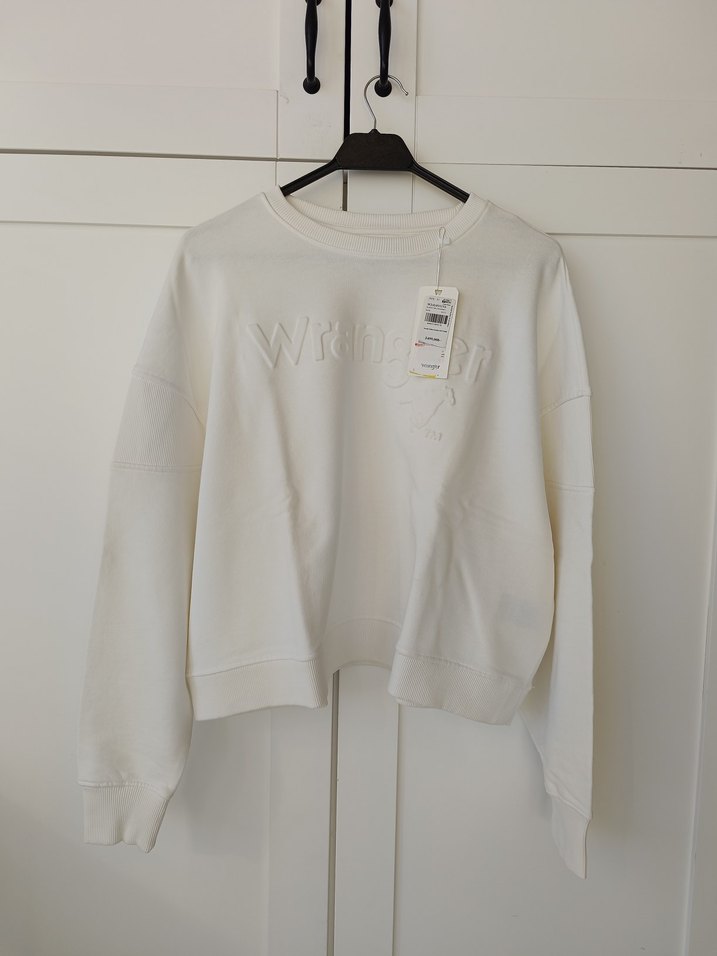 Beyaz renkte, uzun kollu, yuvarlak yakalı ve bol kesim kadın sweatshirtü. Hafif desenli, yumuşak ve sıcak kumaştan, günlük rahat stil için uygundur.