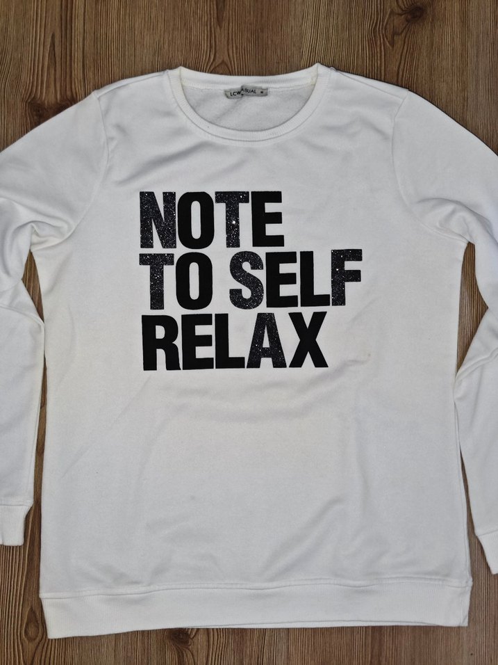 Beyaz, uzun kollu, yuvarlak yakalı, bol kesim kadın sweatshirt. Önünde "NOTE TO SELF RELAX" yazılı baskı mevcuttur. Yumuşak sentetik kumaştan, günlük kullanıma uygundur.