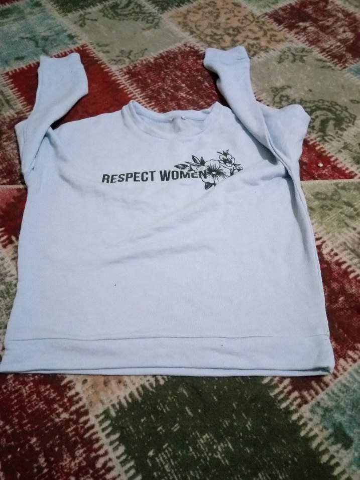 Beyaz renkli, uzun kollu, yuvarlak yakalı ve bol kesim kadın sweatshirtü. Önünde "RESPECT WOMEN" yazısı ve çiçek baskısı bulunur, yumuşak ve sıcak kumaştan üretilmiştir.