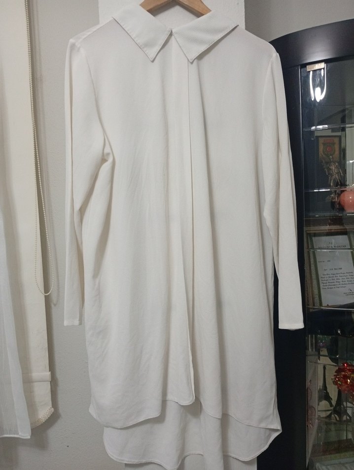Beyaz, uzun kollu, yakalı kadın tunik. Rahat kesimi ve dökümlü tasarımıyla, ipeksi dokuda, desensiz ve minimalist tarzda günlük kullanıma uygun.
