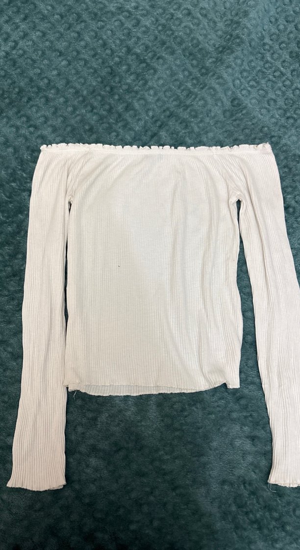 Beyaz, uzun kollu, kayık yaka, triko kumaştan yapılmış, vücuda oturan kadın kazak. Düz ve desensiz, günlük ve sokak stiline uygun.
