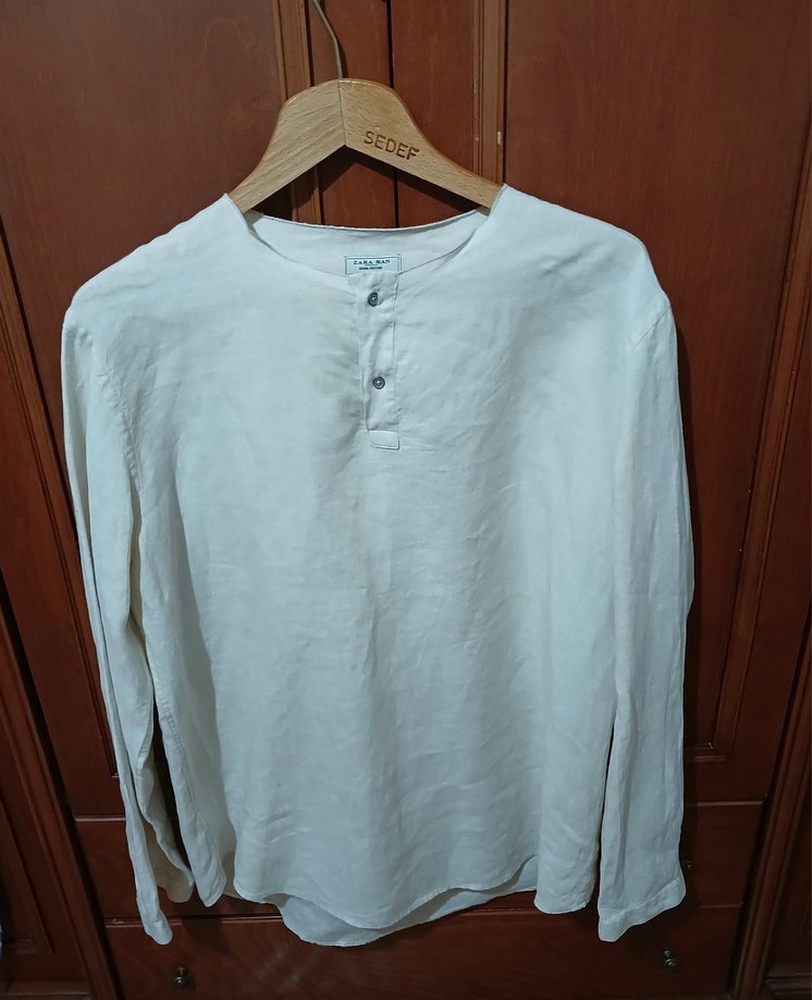 Gevşek kesim beyaz keten erkek gömlek, uzun kollu ve yuvarlak yakalı, düğmeli ön detaylı. Minimalist tarz, günlük rahat kullanım için uygun. krem rengi 2 kol arası 67 cm,omuzdan boyu 73 cm ve kol boyu 68 cm dir.Zara firmasının özel tasarımıdır. salaş model olup çok şık.