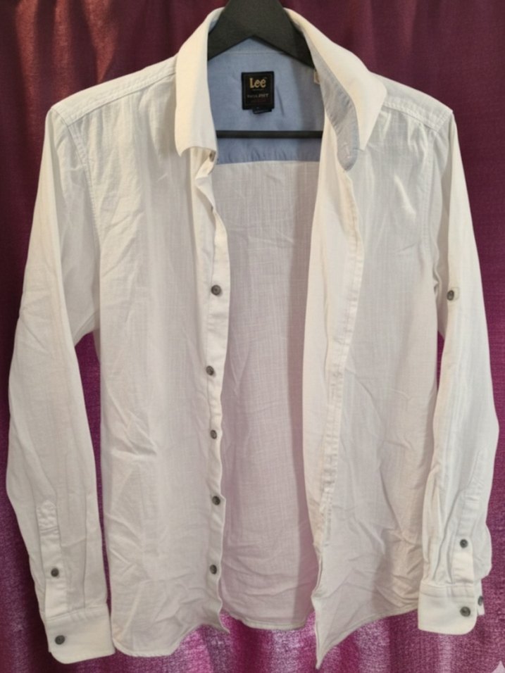 Beyaz keten kumaştan, yakalı ve düğmeli, uzun kollu, normal boy erkek gömlek. Rahat ve günlük sokak stiline uygun.
