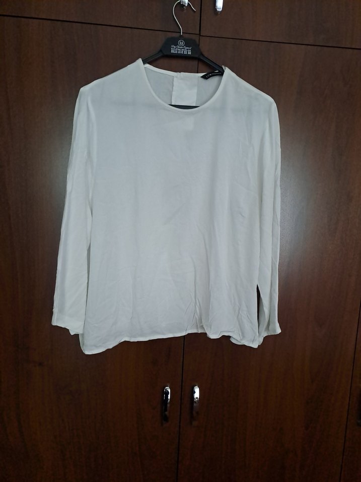 Beyaz keten kumaştan, uzun kollu, yuvarlak yakalı, salaş kesim kadın bluz. Düz ve desensiz, normal boyda, minimal tarzda günlük kullanım için uygun.