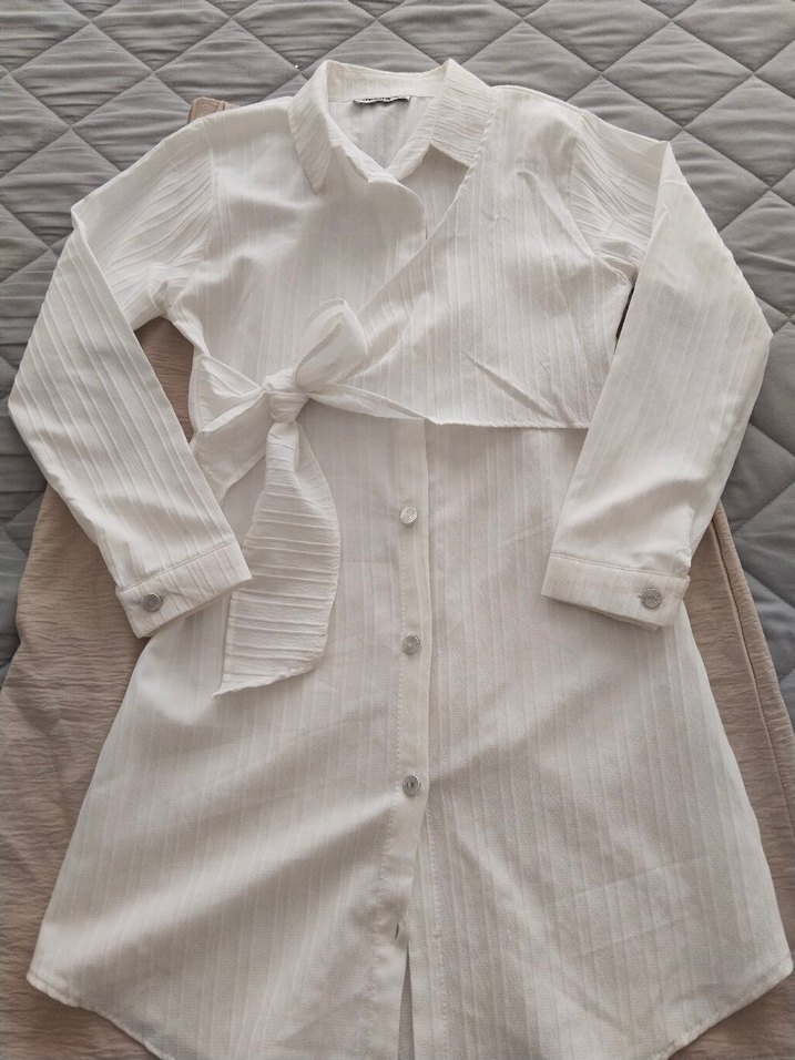 Beyaz keten kumaştan, uzun kollu ve pile detaylı, klasik yakalı, düğmeli kadın gömlek. Ofis kullanımı için uygun, rahat kesim. s m beden uyumlu