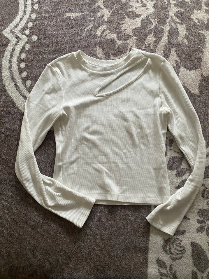 Beyaz, uzun kollu, keten kumaştan yapılmış, dar kesim, yuvarlak yakalı kadın tişörtü. Normal boyda ve desen içermeyen sade tasarımıyla günlük sokak stili için uygundur.