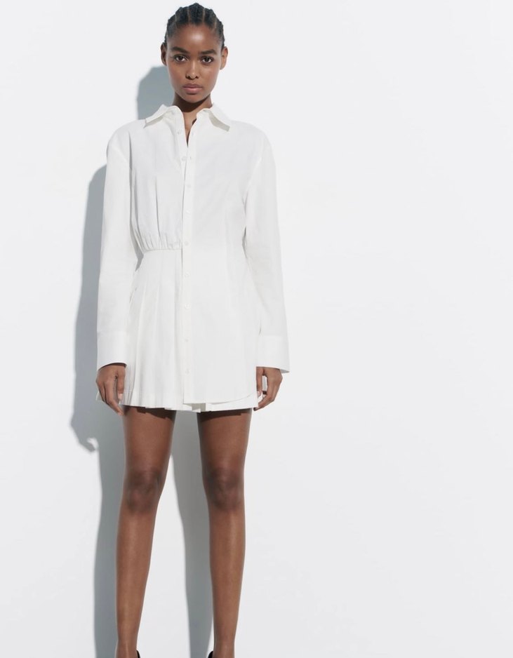 Beyaz renkte, keten kumaştan uzun kollu, yakalı ve regular fit mini elbise. Minimalist ve şık tasarımıyla günlük kullanıma uygundur.
