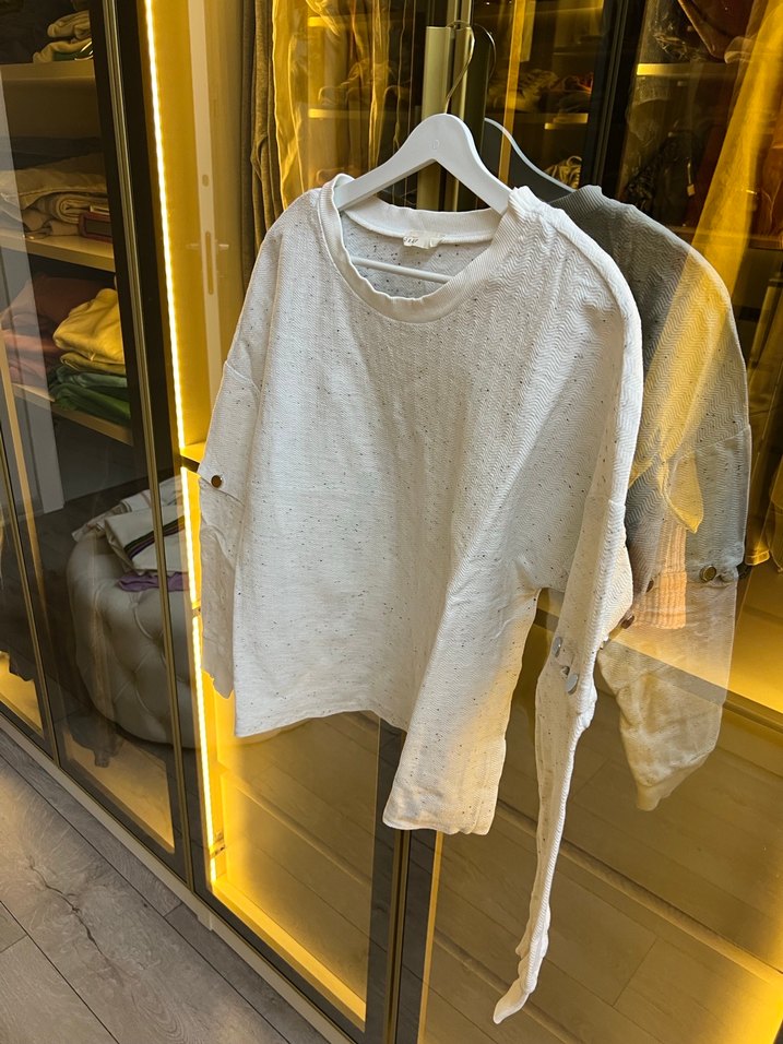 Beyaz renkli, keten kumaştan uzun kollu ve salaş kesim sweatshirt. Günlük kullanıma uygun, rahat ve şık bir sokak stili parçası. ✨