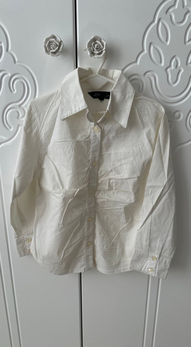 Beyaz pamuklu kumaştan, uzun kollu, yakalı ve düğmeli ön kısmı olan gömlek. Normal boy ve parlak yüzeye sahip✨