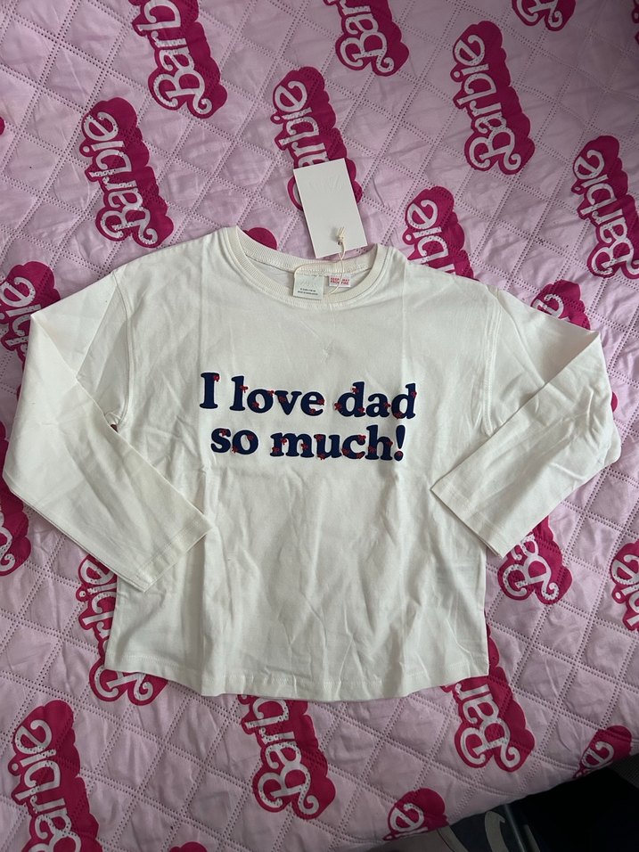Pamuklu, beyaz uzun kollu kız tişörtü, bol kesim ve yuvarlak yaka ile. Örgü dokulu ve "I love dad so much!" yazılı baskısı var. Rahat ve trend tarzda.