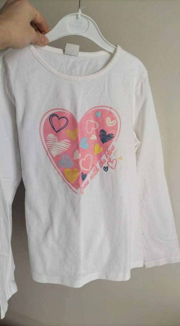 Pamuklu, bisiklet yaka beyaz uzun kollu kız tişörtü, pastel renklerde kalp baskılıdır. Trendy ve rahat bir sokak stili için uygundur. Sadece 1 kez giyildi tertemiz yeniden farksız .