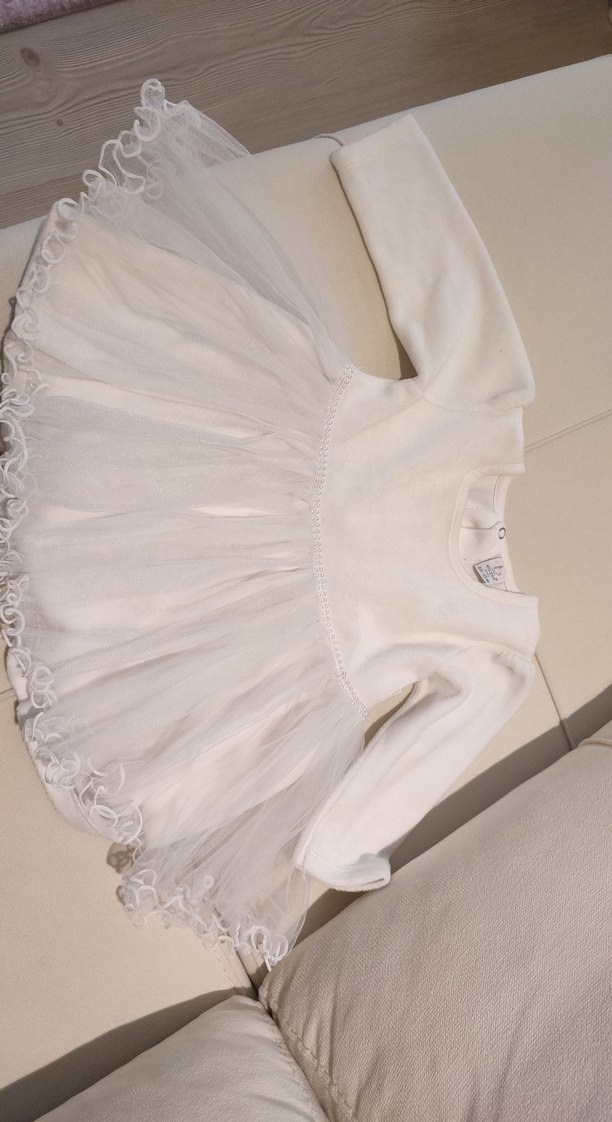 Beyaz, uzun kollu, yuvarlak yakalı ve yumuşak sıcak kumaştan yapılmış, oturan kesimli kız elbisesi. Fırfırlı etek kısmı zarif bir dokunuş katıyor.