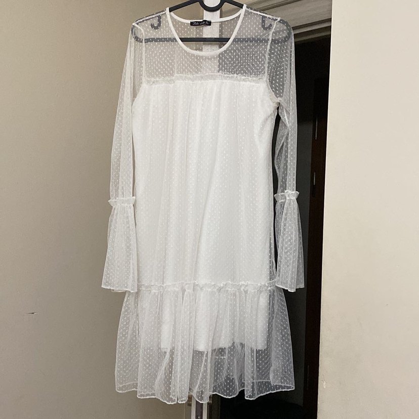 Uzun kollu, bol kesim beyaz midi elbise, fırfır detaylıdır. Yumuşak sentetik kumaştan yapılmış, yuvarlak yakalı ve hafif noktalı dokuya sahiptir. Düğün ve şık etkinlikler için uygundur. Ben düğünde dış çekimde kullandım