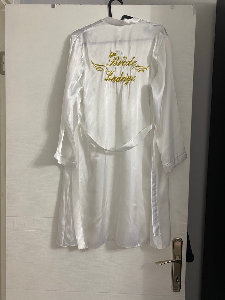 Uzun kollu, bol kesim beyaz midi sabahlık. Parlak yüzeye sahip, sırtında "Bride" yazısı bulunan minimal bohem tarzda bir tasarım.