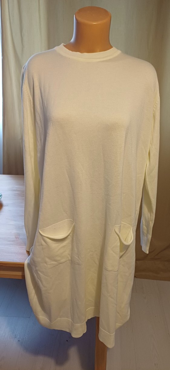 Beyaz renkli, uzun kollu, yuvarlak yakalı, midi uzunlukta ve bol kesim triko elbisedir. Yumuşak ve rahat dokulu, iki ön ceplidir.