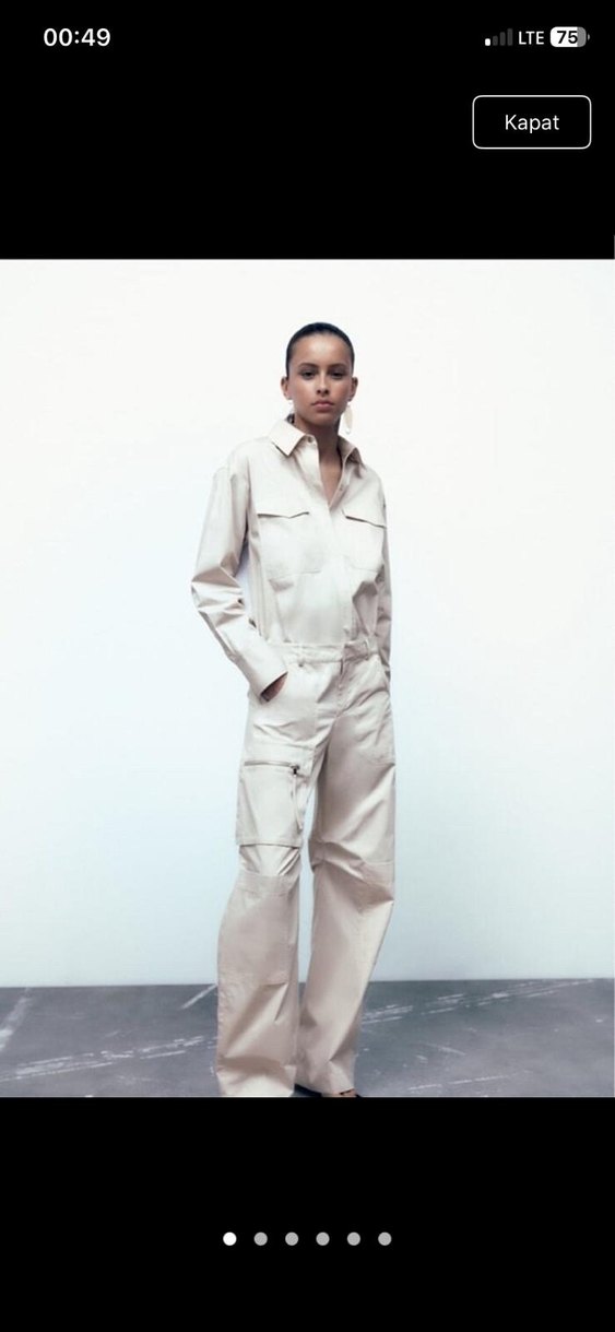 Beyaz pamuk tulum, uzun kollu ve yakalıdır. Minimalist tasarımı ve midi boyu günlük kullanıma uygundur. Rahat ve şık bir görünüm sunar.