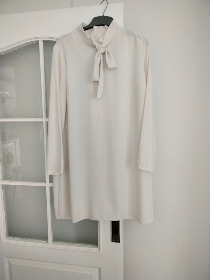 Beyaz tunik, bağlamalı halter yaka ve uzun kollu. Rahat kesim, düzgün sentetik kumaşla modern klasik ofis şıklığı sunar.temiz sorunsuz ürün boy 90 cm iki koltuk aradı mesafe 59 cm alt uzunluk 72 cm