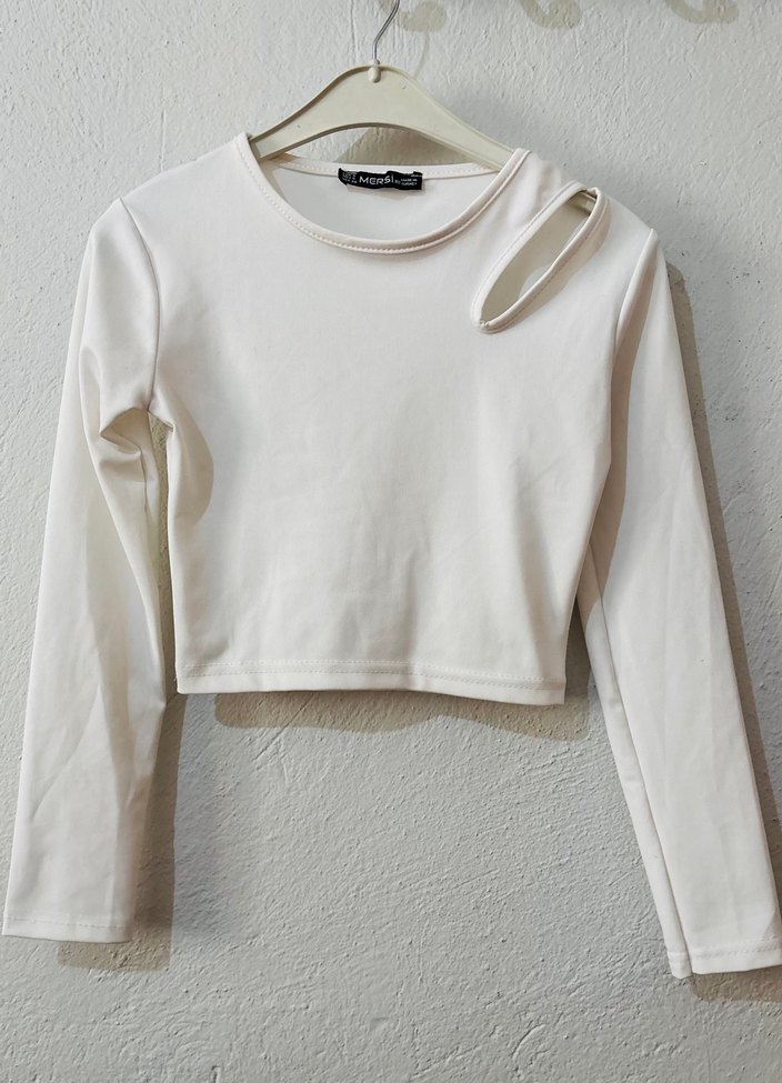 Beyaz renkli, uzun kollu ve bisiklet yaka mini bluzdır. Omuzda şık bir kesim detayı bulunur. Rahat sentetik kumaştan üretilmiştir.