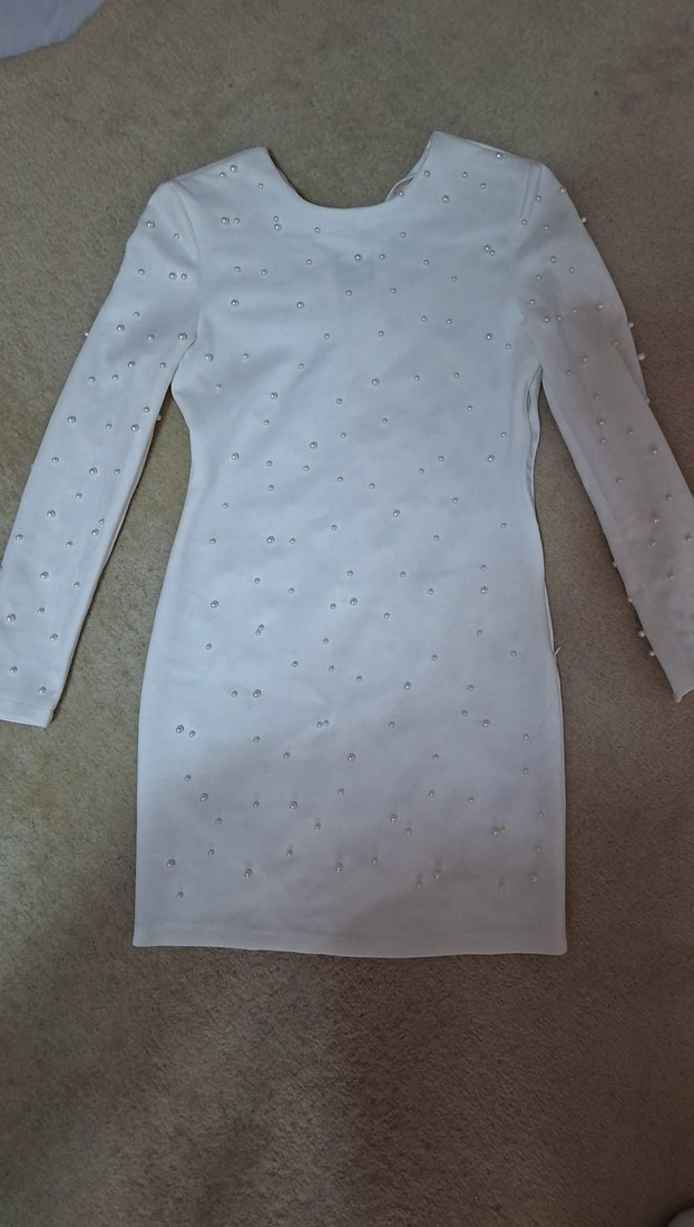 Beyaz uzun kollu mini elbise, sıkı kesim ve yuvarlak yakaya sahiptir. Sentetik kumaş üzerinde boncuk detaylarıyla minimalist ve şık bir sokak tarzı sunar. ✨
