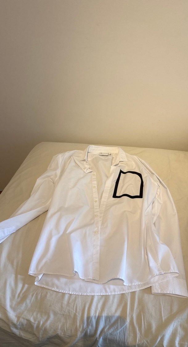 Yumuşak keten kumaştan, yakalı ve düğmeli beyaz uzun kollu gömlek. Salaş kesim ve koyu renk cep detayıyla sokak modasına uygun.