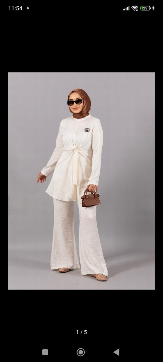 Beyaz renkte, uzun kollu, yüksek yakalı ve bağlama desenli keten kumaştan yapılmış minimalist kadın takımı. Rahat kesimi ve uzun boyu günlük kullanıma uygundur. 1 kez kullanıldı mavi rengi de mevcut