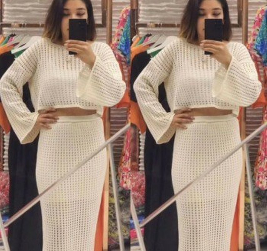 Beyaz renk, uzun kollu, örgü kumaştan yapılmış, bohem tarzda işlemeli desenli, vücuda oturan uzun elbise.