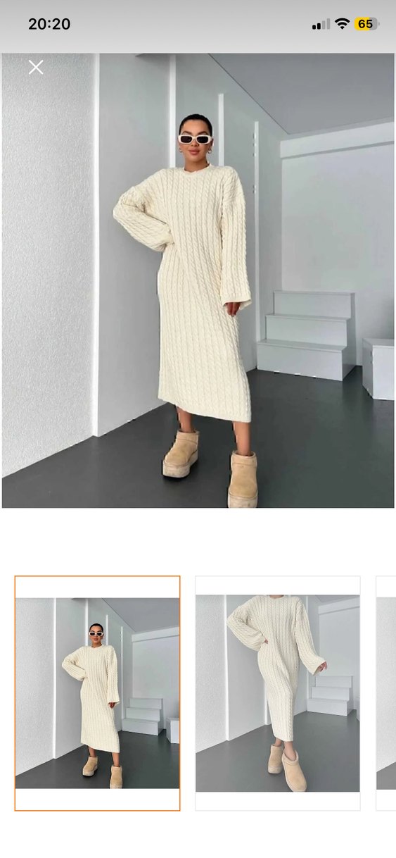 Beyaz renkli, uzun kollu ve örgü detaylı kadın elbisesi. Yün kumaştan, bol kesim ve yuvarlak yakalıdır. Günlük rahatlık ve trend görünüm sunar.
