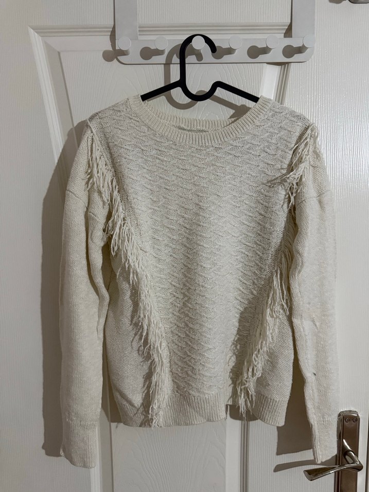 Beyaz renkli, örgü dokulu, yuvarlak yaka ve uzun kollu kadın kazak. Salaş kesimi ve püskül detaylarıyla rahat bir görünüme sahiptir. Xs-S-M bedenler giyebilir
