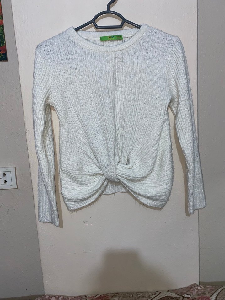 Beyaz renkli, uzun kollu ve yuvarlak yakalı kadın kazak. Yumuşak örgü kumaştan üretilmiş, bel kısmında düğüm detayı bulunur. Rahat ve şık bir görünüm sunar.