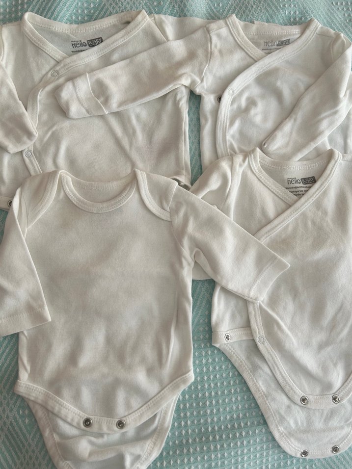 Yumuşak pamuktan yapılmış, beyaz uzun kollu bebek bodyleri, crew neck ve sade tasarımla günlük kullanım için uygundur. 3 tanesi öndende çıtçıtlıdır çok kullanışlıdır çok rahat kullanmıştım elleri eldivenlidir 1 adet normal çıtçıtlı vardır önlerinde sarılıklar vardır resimleri ekledim kullanıma engel değil belli bile olmuyor hello baby markadır yenidoğan 50 cm’dir
