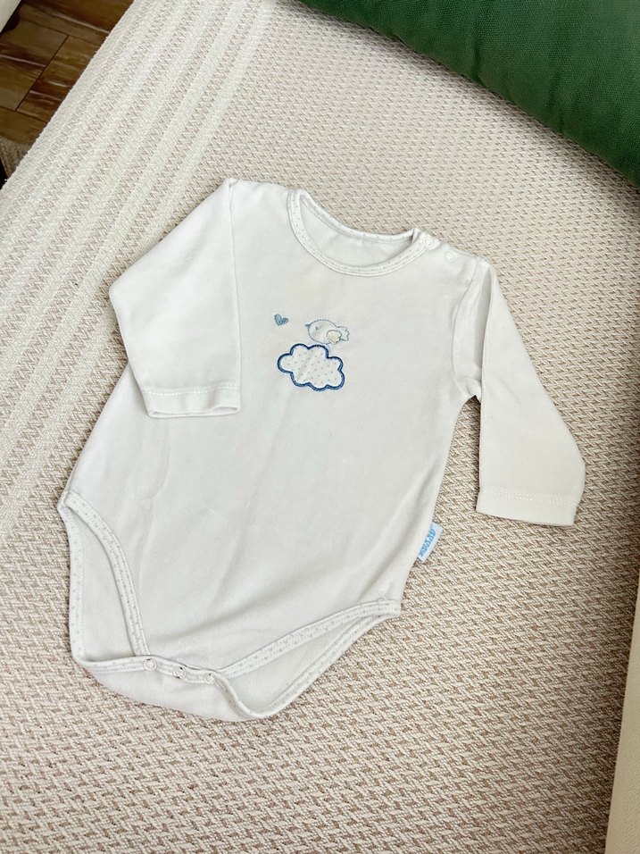 3-6 ay uyumluBeyaz renkli, uzun kollu ve yuvarlak yakalı pamuklu bebek body, önünde bulut ve kuş işlemeli örme dokuda.