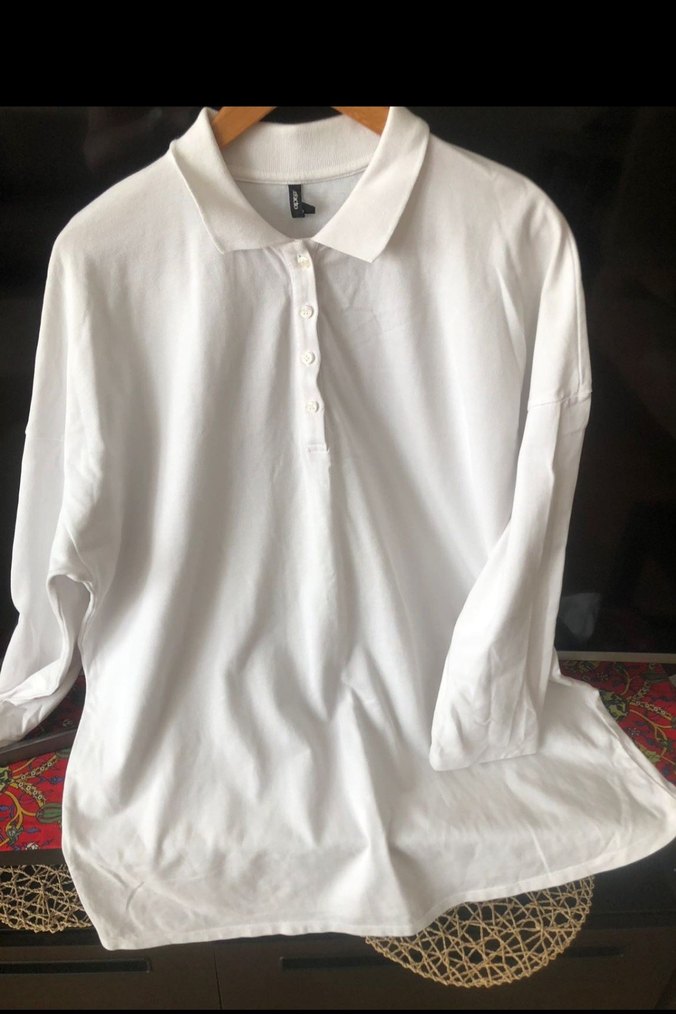 Pamuklu beyaz, uzun kollu, yakalı ve düğmeli, bol kesim normal boy polo tişört. Günlük rahat sokak stili için uygundur.