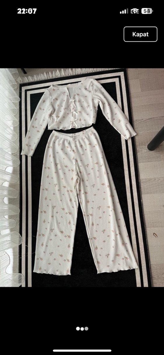 Uzun kollu, bol kesim ve midi boy beyaz pijama takımı. Pastel desenli yumuşak kumaşıyla rahat ve şık bir görünüm sunar. 1.62 boya bıraz kısa oluyor belirtildigi yerde ufacık lekeler var belli olmuyor