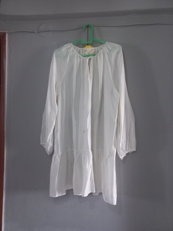 Yumuşak keten kumaştan yapılmış beyaz, uzun kollu, salaş kesim hamile bluzu. Yuvarlak yakalı ve midi boyda, günlük kullanıma uygundur.