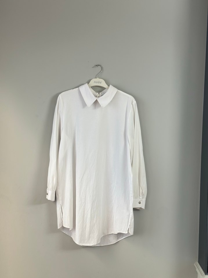 Beyaz kumaştan, yakalı ve uzun kollu salaş kesim gömlek. Midi boyu ve sade tasarımıyla günlük kullanıma uygun, zahmetsiz şıklık sunar.