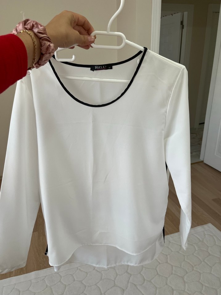 Siyah detaylı yuvarlak yakalı, parlak sentetik kumaştan yapılmış beyaz uzun kollu, salaş kadın bluz. ✨