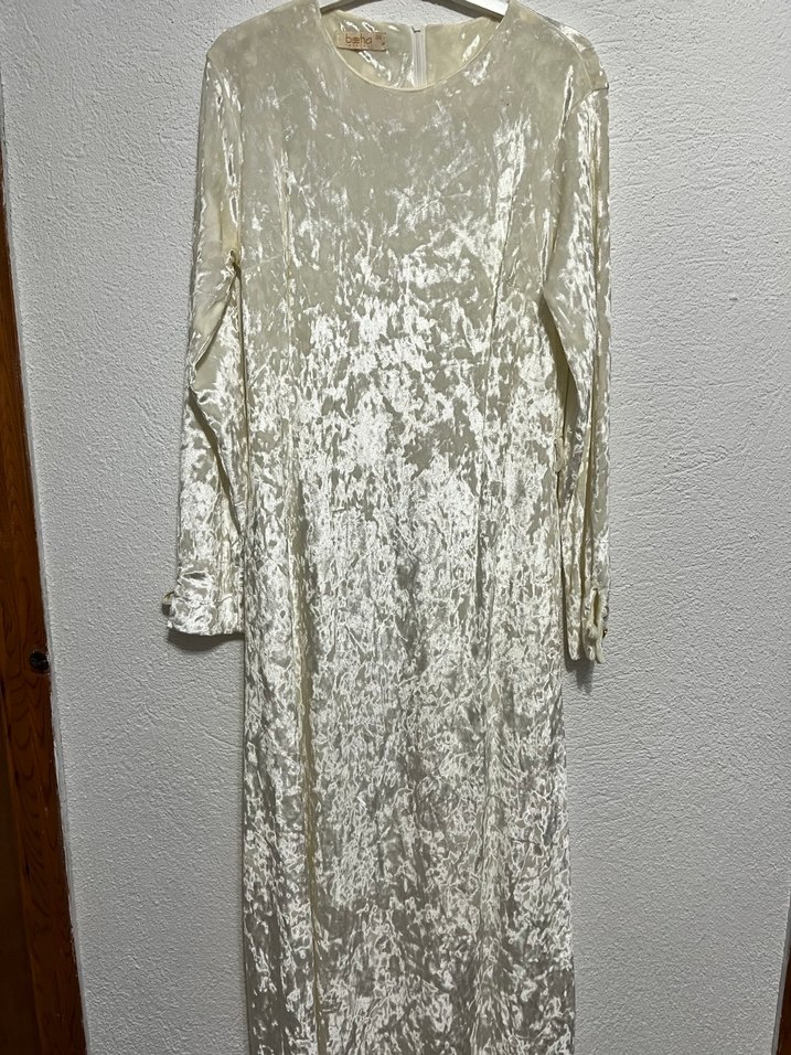 Beyaz uzun kollu, salaş kesim ve drapeli tasarıma sahip parlak keten kumaştan yapılmış elbise. Yuvarlak yaka ve vintage bohem tarzda, düğün için uygun.